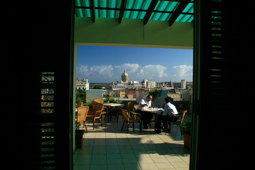27th February 2009: Men chat at a table on the roof of the Hotel Plaza in Haban, Cuba. Picture by David Pillinger.