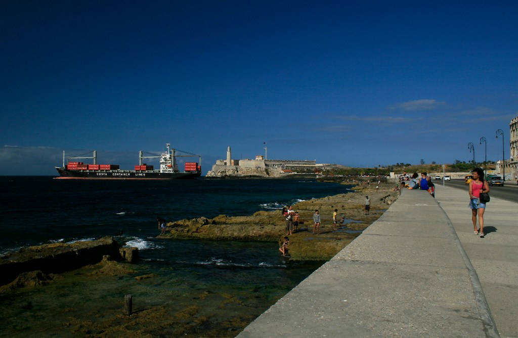 7th March 2009: A woman in a red shirt walks down thr famous Malecon as a container ship pulls out of Habana harbour, Habana, Cuba. Picture by David Pillinger.