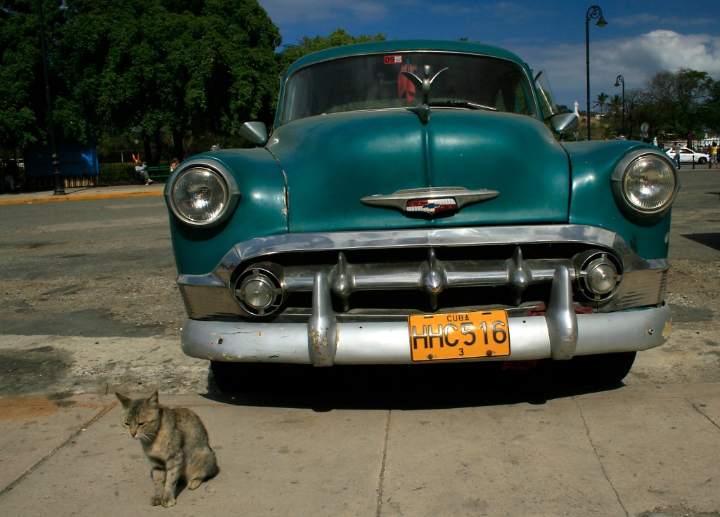 7th March 2009: A cat sits in front of an old Chevrolet motor car, Habana, Cuba. Picture by David Pillinger.