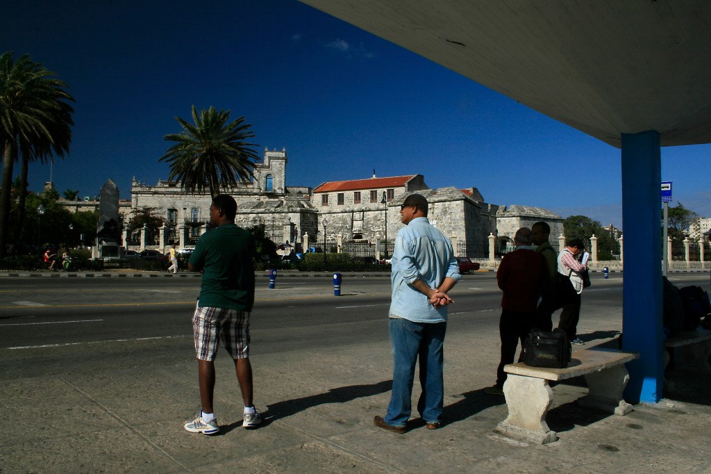 6th March 2009: People wait for a bus in front of the Castillo de la Real Fuerza in Habana, Cuba. Picture by David Pillinger.