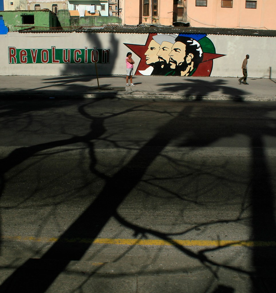 7th March 2009: Trees cast early morning shadows on people and a Revolution mural, Habana, Cuba. 2009 is the 50th anniversary of the Cuban Revolution. Picture by David Pillinger.