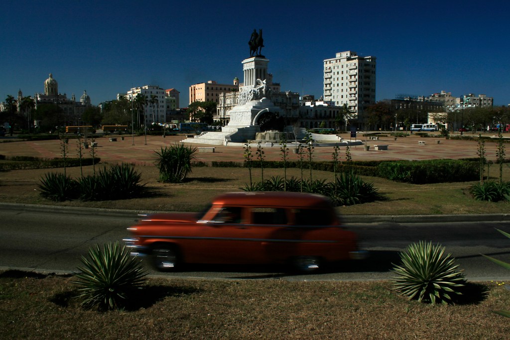 7th March 2009: An old American car drives in front of the Statue of General Maximo Gomez in Habana, Cuba. Picture by David Pillinger.