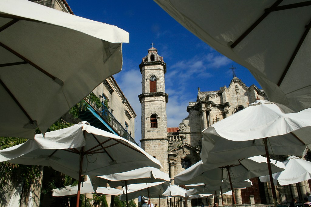 6th March 2009: Restaurant umbrellas in front of the Catedral de San Cristobal de la Habana in Habana, Cuba. Picture by David Pillinger.