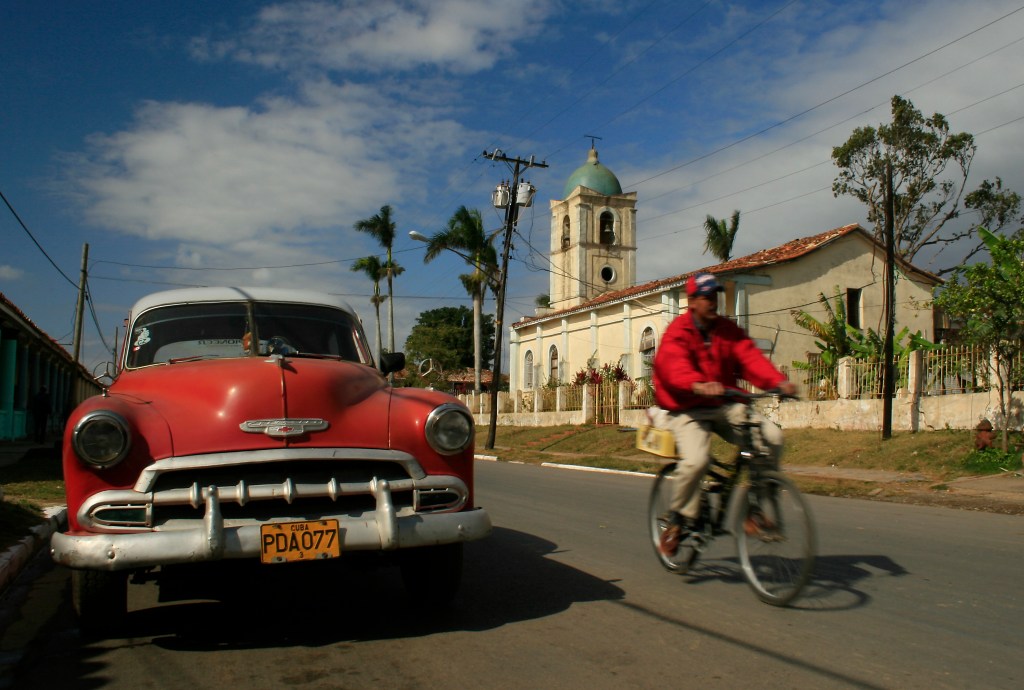 2nd March 2009: A man cycles past the church in Vinales, Pinar del Rio province, Cuba. Picture by David Pillinger.