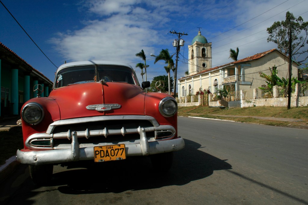 2nd March 2009: An old Chevrolet car is parked outside the church in Vinales, Pinar del Rio province, Cuba. Picture by David Pillinger.