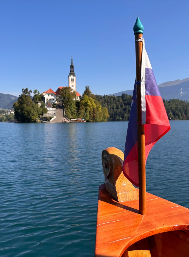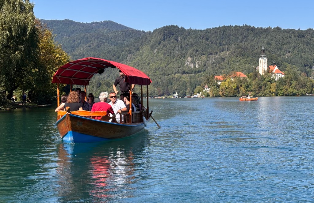 It was now time to join an iconic Pletna boat for the ride out to the island. There are 23 wooden Pletna boats on Lake bled and this is the only place they are found in the world. A Pletna, borrowed from the German for ‘flat-bottomed boat’, can seat 20 people under a colorful canopy and are steered by a standing oarsman. The fare is 20 Euros per person and includes a 45 minute stop on the island to explore the essential Church of the Assumption of the Blessed Virgin Mary. Jim and I resisted the offer to climb the tower and ring the bell and instead we gazed out onto the perfect blue of the lake, it’s pristine early calm being disturbed and fragmented as other Pletnas, row boats, and swimming groups headed out to surely one of the most sensational spots on the planet. We walked around the tiny island, took pictures, and I bought a couple of historic postcards showing a horse and sleigh in front of the island when the lake used to regularly freeze over! It was truly a special moment, and we agreed we were very privileged to be ‘right here, right now’. Enchanted and grateful, we met our Pletna oarsman for the trip back to shore, craning our necks and photographing greedily as this majestic and essential sight receded from view.