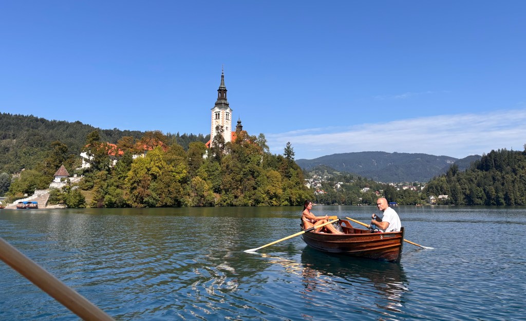Many times, in my travels around the world, I’ve encountered a scene so perfect, so lovely and calming that I’ve wanted to wrap it up and preserve it for eternity. Lake Bled at 6.30am in August was such a time. My brother Jim and I were staying at the Hotel Triglav above the lake and, not for the first time, I was awake before him. I opened the skylight in our room and in the milky blue twilight Lake Bled was right there below me, unblemished, unruffled and utterly mesmerizing. And then the church bells began to chime! From the Church of the Assumption of the Blessed Virgin Mary