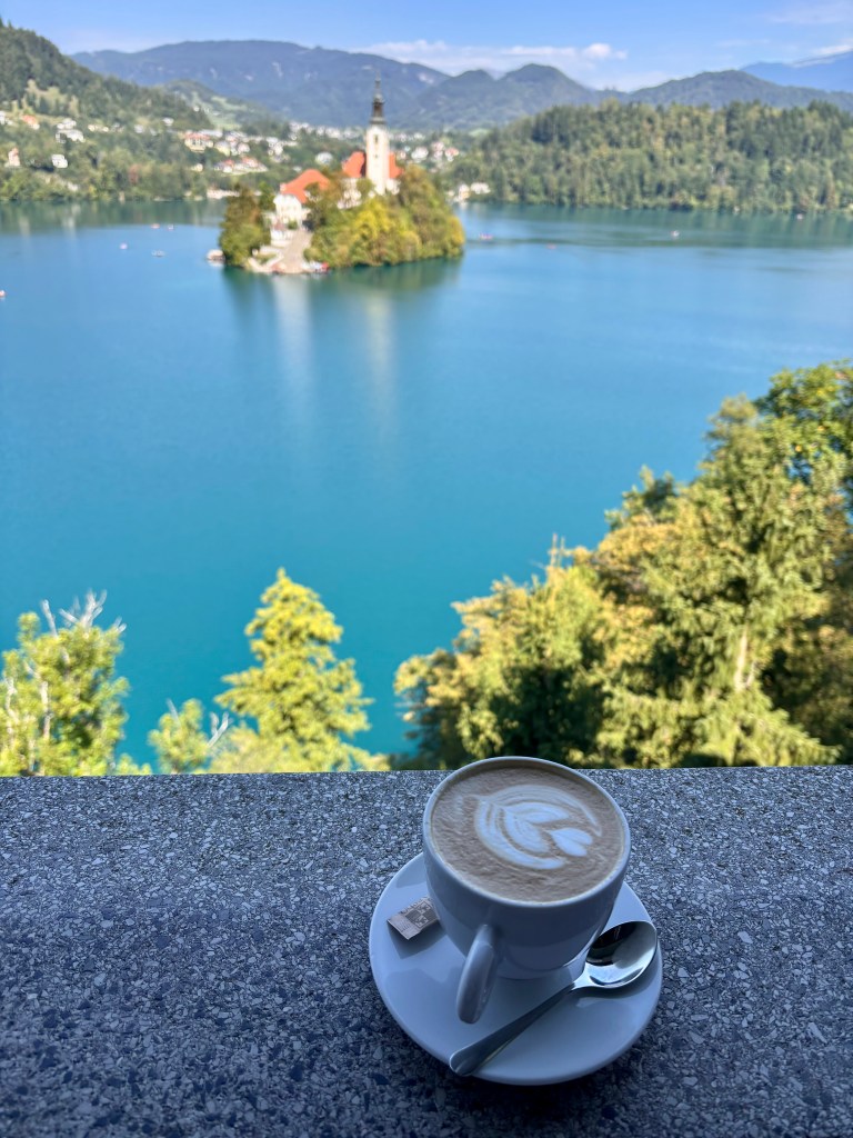 As a self-confessed coffee snob and history buff, the lofty Café Belvedere was an absolute must see for me. Perched high on pillars above Vila Bled, Café Belvedere was designed by the famous Slovenian architect Jože Plečnik as the ‘waiting room’ for audiences of the Yugoslavian King Alexander. Famously, the Yugoslav president Josep Broz Tito hosted members of royalty, presidents and famous people at tea parties with cognac and cigars. The bleak furnishings and historic black and white photographs within these austere, communist era walls, add immensely to the atmosphere. And then there’s the view. The View! Jim and I had a table out on the balcony overlooking Bled island and, at that very moment, there was nowhere else on the planet we’d rather have been. We ordered two more excellent cappuccinos and two large slices of famous (notorious?!) Bled cream cake, or kremna rezina. It’s a local specialty made with a flaky puff pastry base, rich vanilla custard, and whipped cream, all dusted with powdered sugar. The original recipe was created in 1953 at the nearby Hotel Park. We’d almost completed the six-kilometer tour of the lake and the steep steps up from the gravel path to the café itself and so we felt virtuous enough to indulge generously.